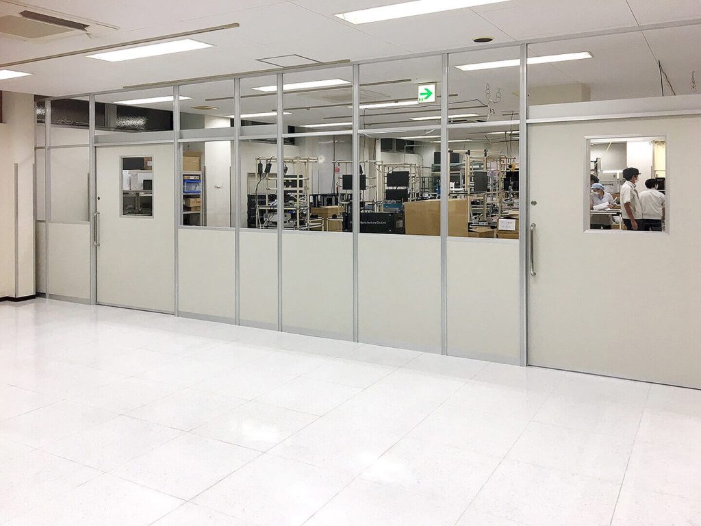 工場内での精密機器の測定に機密性が必要なため、断熱間仕切りにて天井付の独立した部屋を作りました。